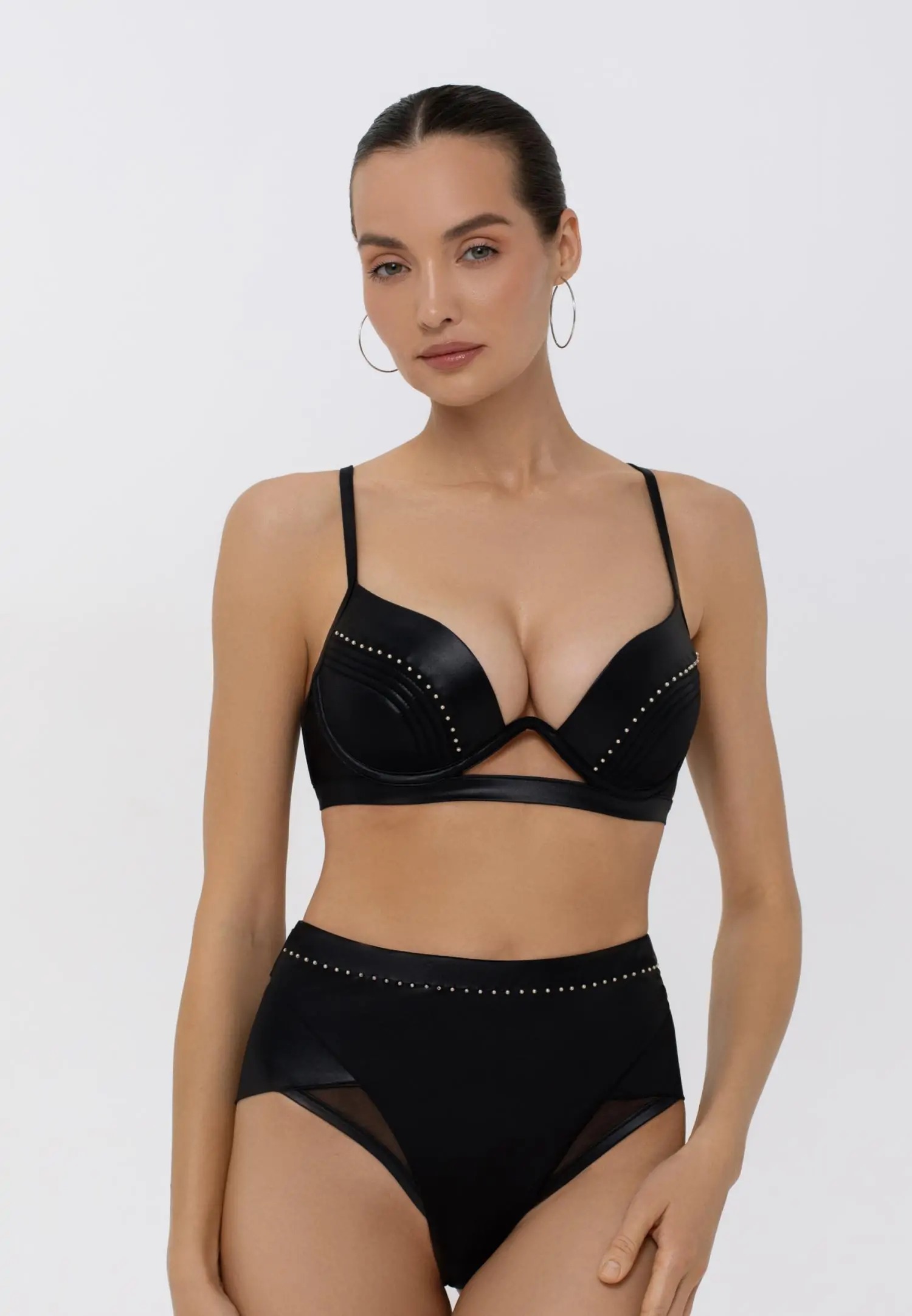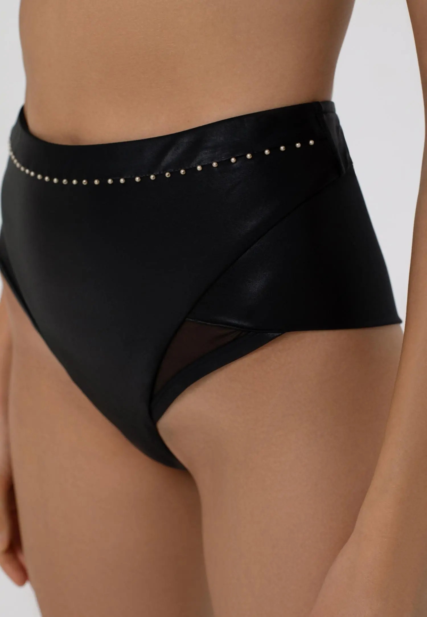 BLACK COUTURE kollektsioon on loodud naisele, kes ei karda silma paista! Carvico kõrgläikega kangas loob luksusliku wet-look efekti, mis püsib ka pärast korduvat kandmist ja pesemist. Materjal on erakordselt vastupidav kloorile, päikesekreemidele ja -õlidele, on kiiresti kuivav ning ei muutu topiliseks. Läbikumavad võrkkangast detailid lisavad sensuaalsust,roosakaskuldsete pärlitega viimistletud detailid annavad elegantse ja jõulise lõppaktsendi. See kollektsioon on enesekindla naiselikkuse kehastus, pakkudes nii julget stiili kui ka maksimaalset mugavust. Kõrge pihaga bikiinipüksid. Tagadetailil on topeltkangas ning jalaava serv on pehme pööratud äärega, ilma kummi ja õmbluseta, pakkudes ideaalset istuvust. Vooder esiküljel pakub lisamugavust ja katvust. Toode on disainitud ja arendatud Eestis!