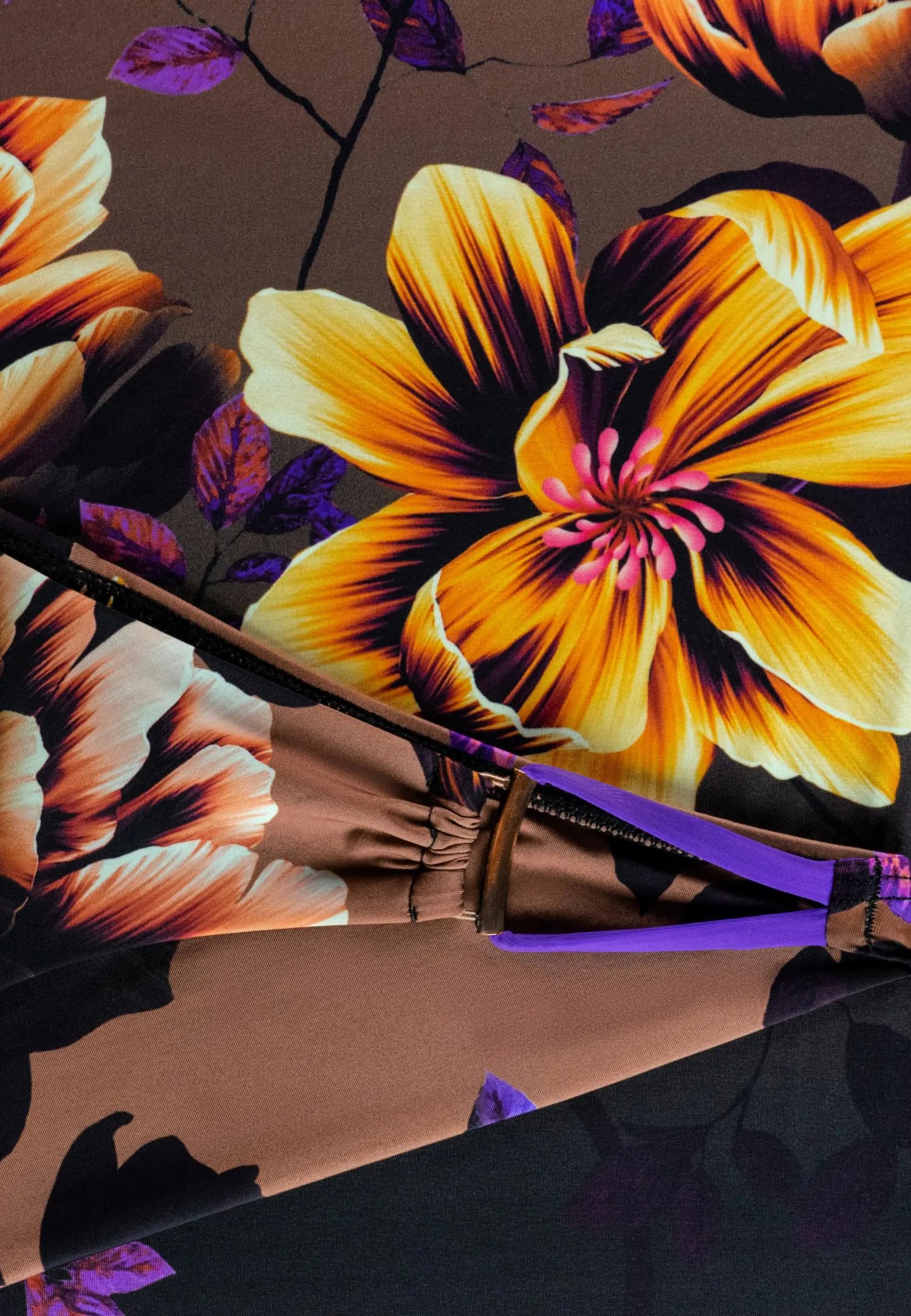 FLOWER MANIA kollektsiooni muster on loodud Itaalia disainimaja poolt ja on spetsiaalselt loodud Marc & André jaoks. Roostepruun taust on inspireeritud hooaja värvitrendidest ja loob ajatu, harmoonilise ilme. Toon-toonis indigo värvi vooder ja õlapaelad täiustavad lehemotiive, samal ajal kui tulbimuster loob dünaamilise ülemineku kollasest oranžini. Metalsed aksessuaarid lisavad peent aktsenti ning kerge, õrnalt läikiv kangas tagab mugavuse ja elegantse välimuse.