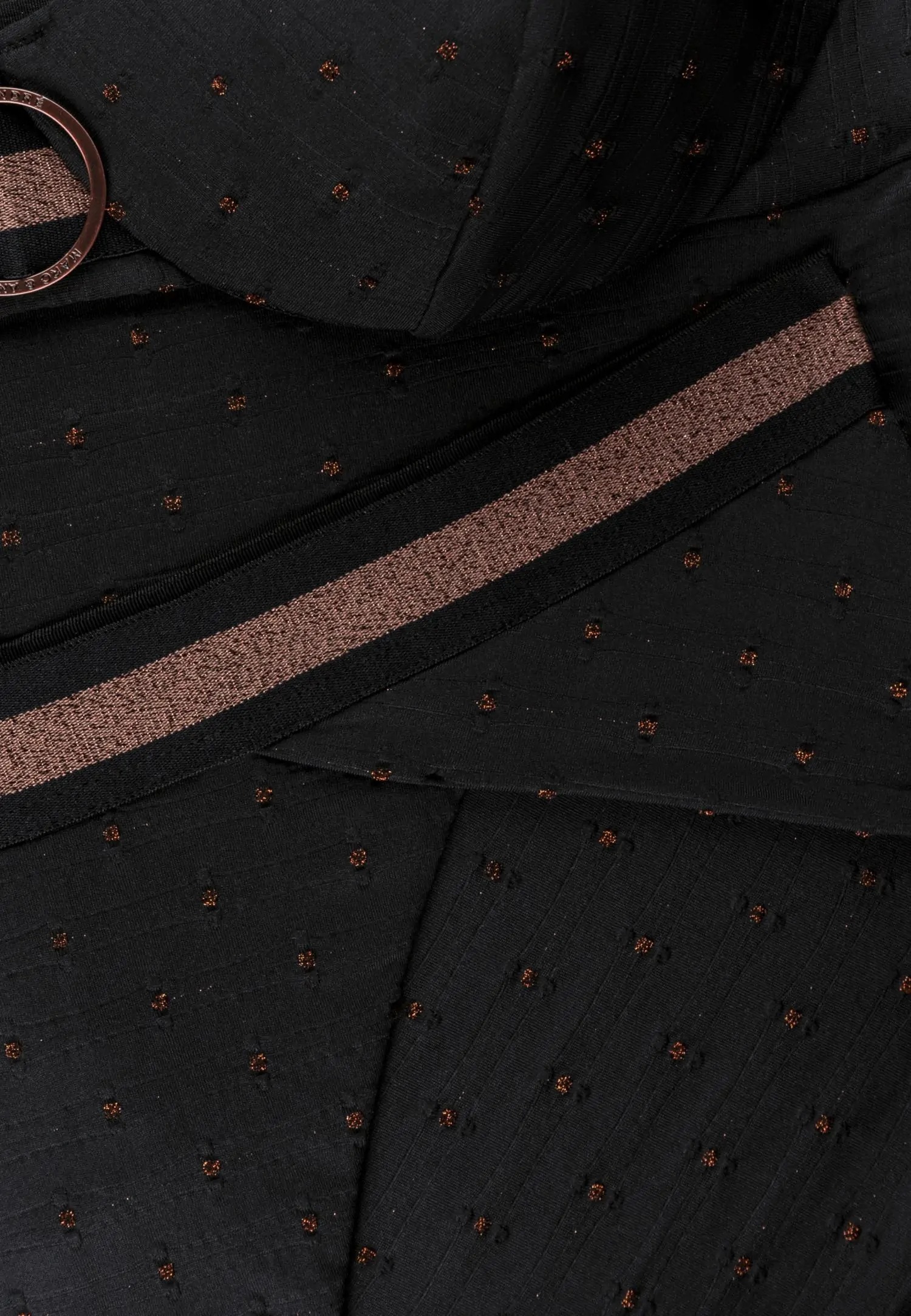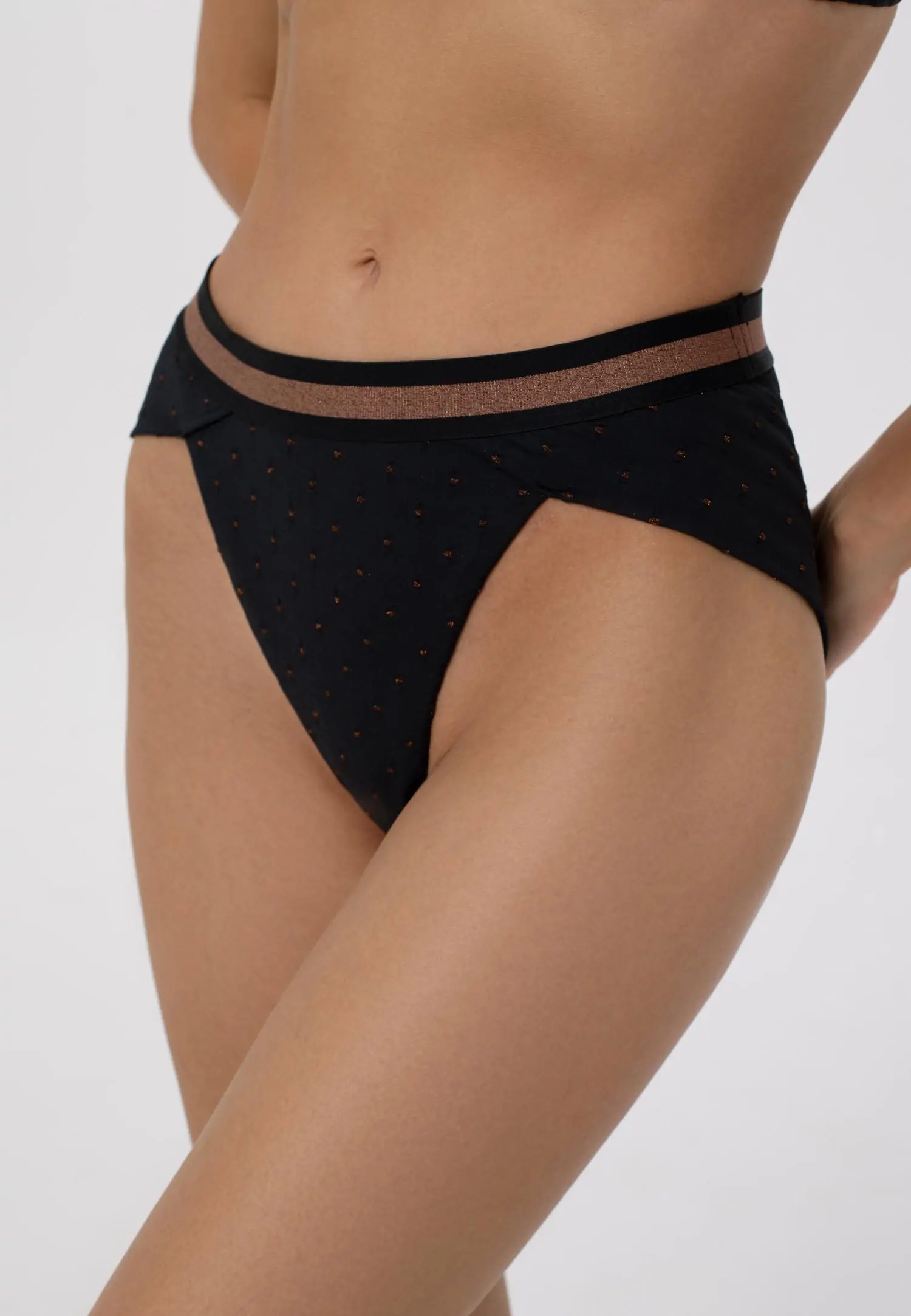 GILDED STAR kollektsioon ühendab ajatult elegantse musta ning peene vasekarva sädeluse. Luksusliku ja rafineeritud ilme loovad õrnalt triibuline kangas ja sissekootud Lurex® sädelev metallikiud . Elastsed detailid ja eritellimusel valmistatud pandlad järgivad sama soojade metallitoonide värvigammat, sidudes kogu kollektsiooni tervikuks. See on rohkem, kui lihtsalt elegantne välimus! Eriliselt pehme ja kerge materjal pakub ka maksimaalset mugavust. Kollektsiooni mudelite valik ulatub julgest ja trendikast kuni klassikaliselt katvama disainini, pakkudes midagi igale kehatüübile ja eelistusele. Kõrgema pihakõrguse ja katvama jalaavaga bikiinipüksid. Vooder nii esi- kui ka tagaküljel, pakkudes lisamugavust, ideaalset katvust ja toestust. Toode on disainitud ja arendatud Eestis!