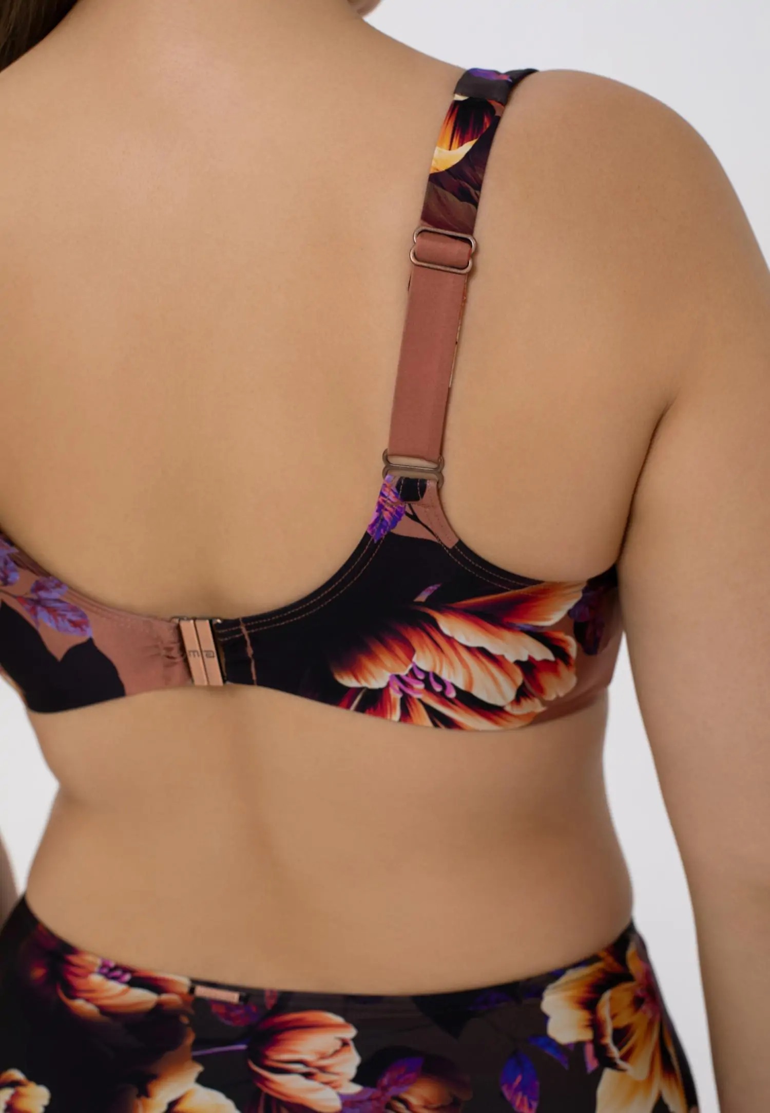 FLOWER MANIA kollektsiooni muster on loodud Itaalia disainimaja poolt ja on spetsiaalselt loodud Marc & André jaoks. Roostepruun taust on inspireeritud hooaja värvitrendidest ja loob ajatu, harmoonilise ilme. Toon-toonis indigo värvi vooder ja õlapaelad täiustavad lehemotiive, samal ajal kui tulbimuster loob dünaamilise ülemineku kollasest oranžini. Metalsed aksessuaarid lisavad peent aktsenti ning kerge, õrnalt läikiv kangas tagab mugavuse ja elegantse välimuse.