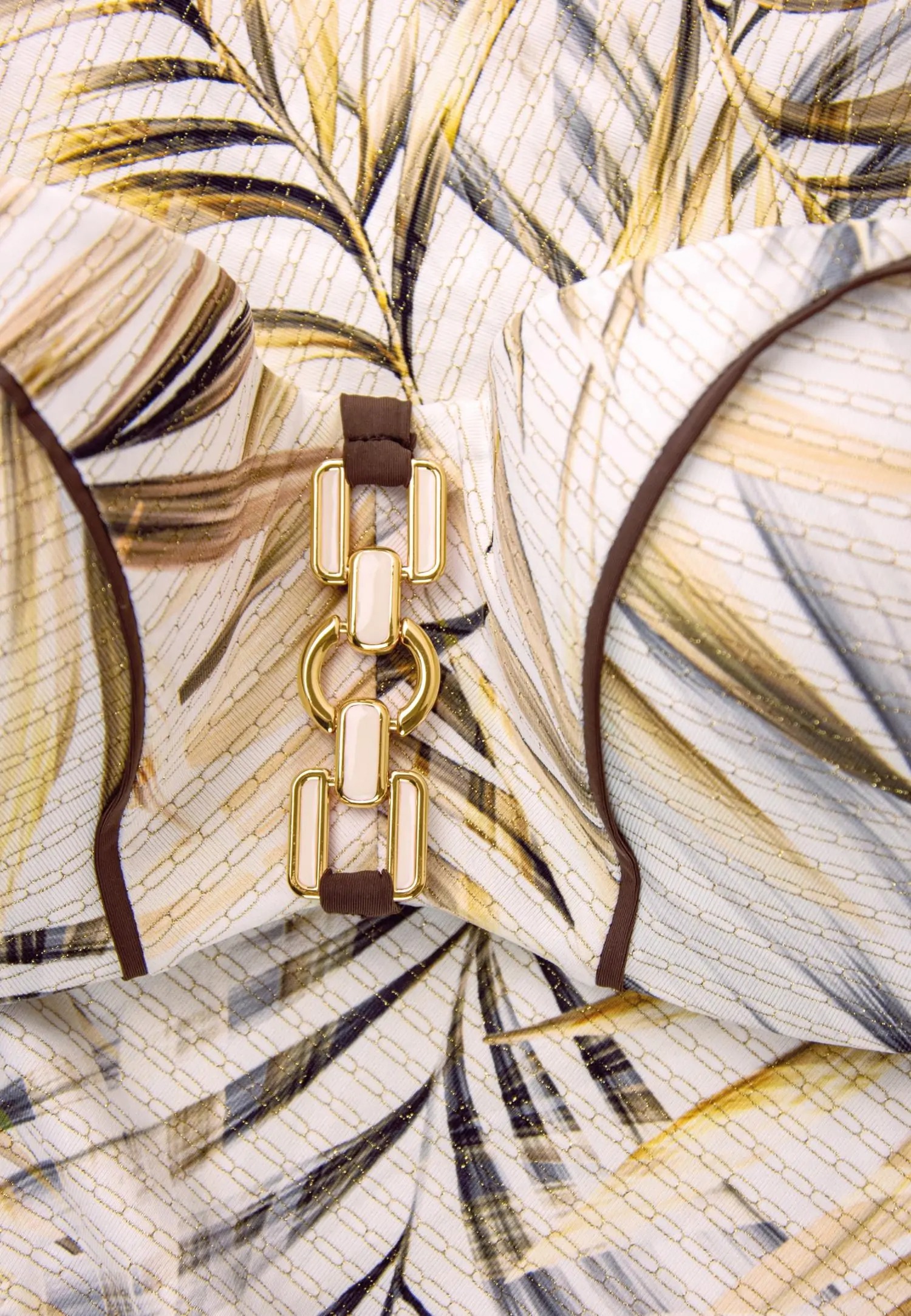 IBIZA FEELING’u sari loob tõeliselt zen-olemise oma rahuliku liivakarva trükidisainiga. Harmooniline värvigamma võlub kõrreliste motiividega, mida ilmestavad kontrastsed kakao-pruunid vööpaelad ning kandid. Õrnalt sädelev sissekootud kuldne metallikniit helgib kui paradiisisaare vee sillerdus. Sirgejoonelise dekolteejoonega bandoo-stiilis bikiinitopp. Rinnaosa on toestatud tugikaartega ning eemaldatava polsterdusega. Lisatoestust pakub ka rinnaalune elastikkumm. Topil on reguleeritavad ja eemaldatavad õlapaelad, mida saab ka tagant risti panna või kaela taha siduda. Esidetailil on sisseõmmeldud silikoonriba, mis tagab fikseeritud istuvuse ka ilma õlapaelteta kandmisel. Toode on disainitud ja arendatud Eestis!