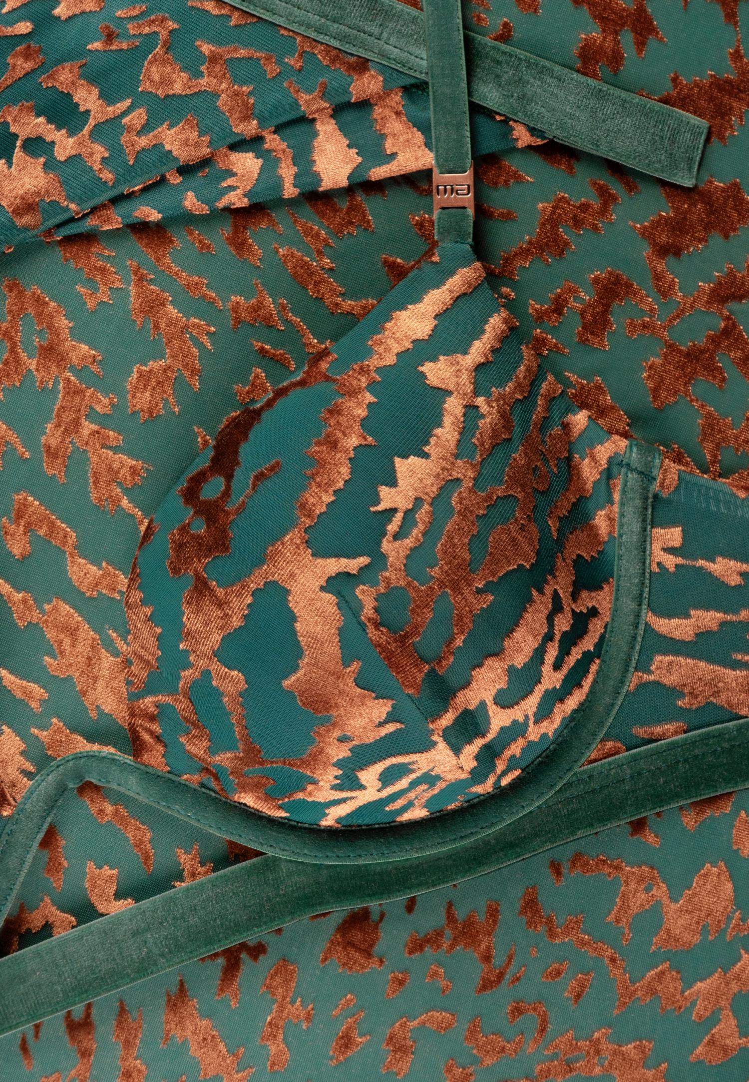 NATURE’S MELODY kollektsioon ühendab endas loodusest inspireeritud disaini ja jätkusuutlikkuse. Ümbertöödeldud polüestrist valmistatud pehme sametkangas loob luksusliku tekstuuri, tumeroheline ja vasekarva toonid toovad esile sügavuse ja elegantsuse. Valguse käes mänglevad sametdetailid meenutavad troopilisi koralle ja loodusmustreid. Minimalistlikku siluetti täiendavad sametist elastikpaelad, metalsed detailid ja V-lõikelised aktsendid, mis aitavad kaunilt siluetti rõhutada. See kollektsioon on loodud neile, kes hindavad kvaliteeti, isikupära ja keskkonnasõbralikku luksust. Vormitud korvide ja tugikaartega bikiinitopp, millel on eemaldatavad push-up padjakesed. Toestav mono-tugikaar on tõeliselt trendikas ning tekitab seksika kolmnurkse väljalõike. Reguleeritava pikkusega õlapaelad. Seljaosal niklivabast metallist kinnitus. Toode on disainitud ja arendatud Eestis!