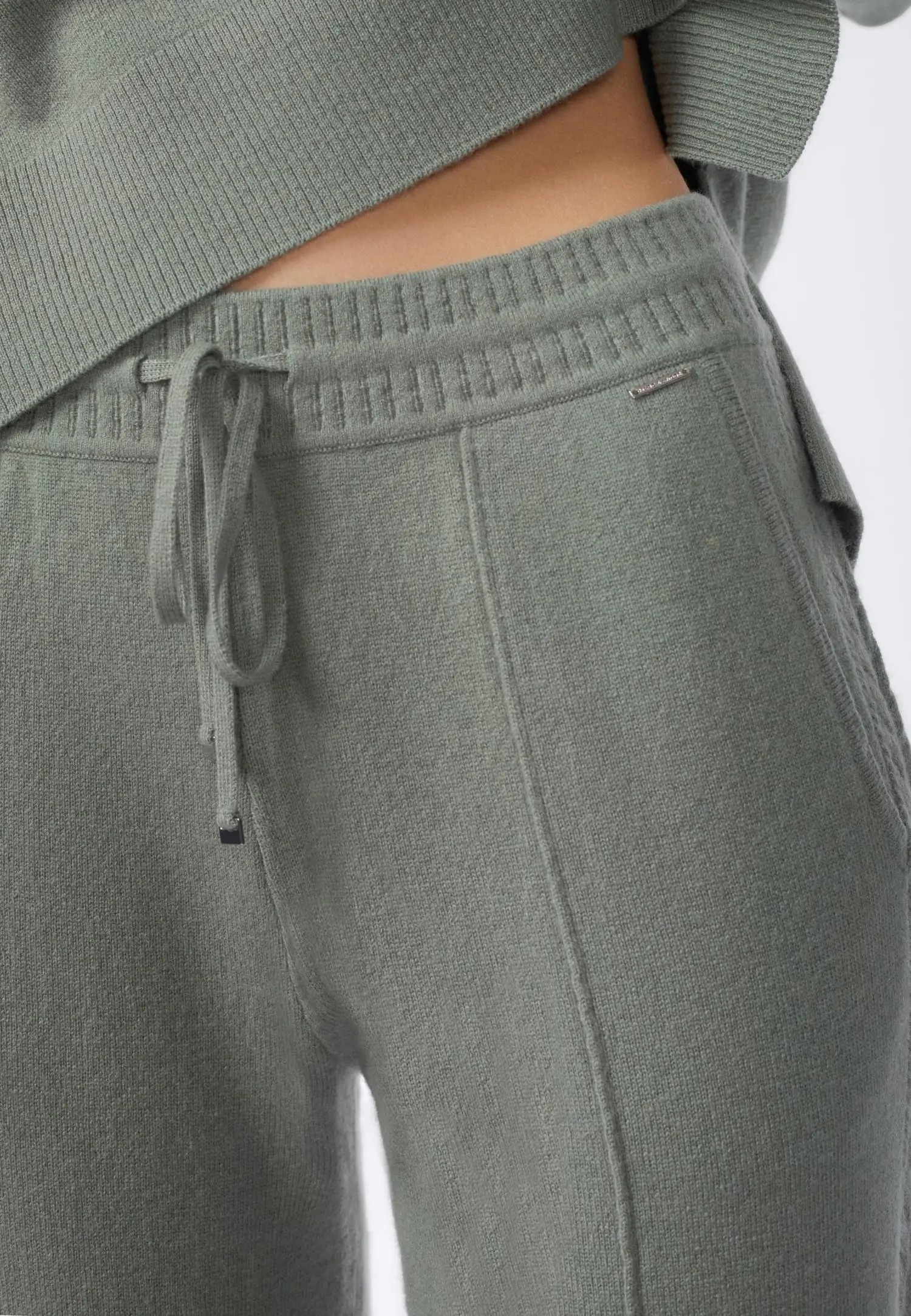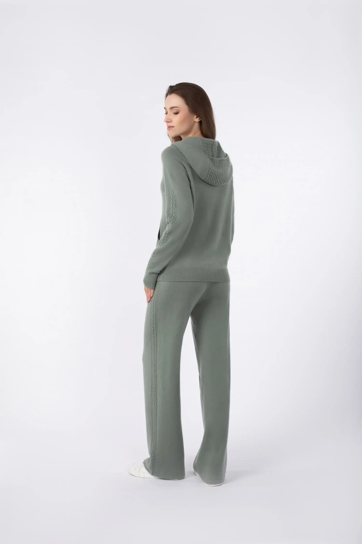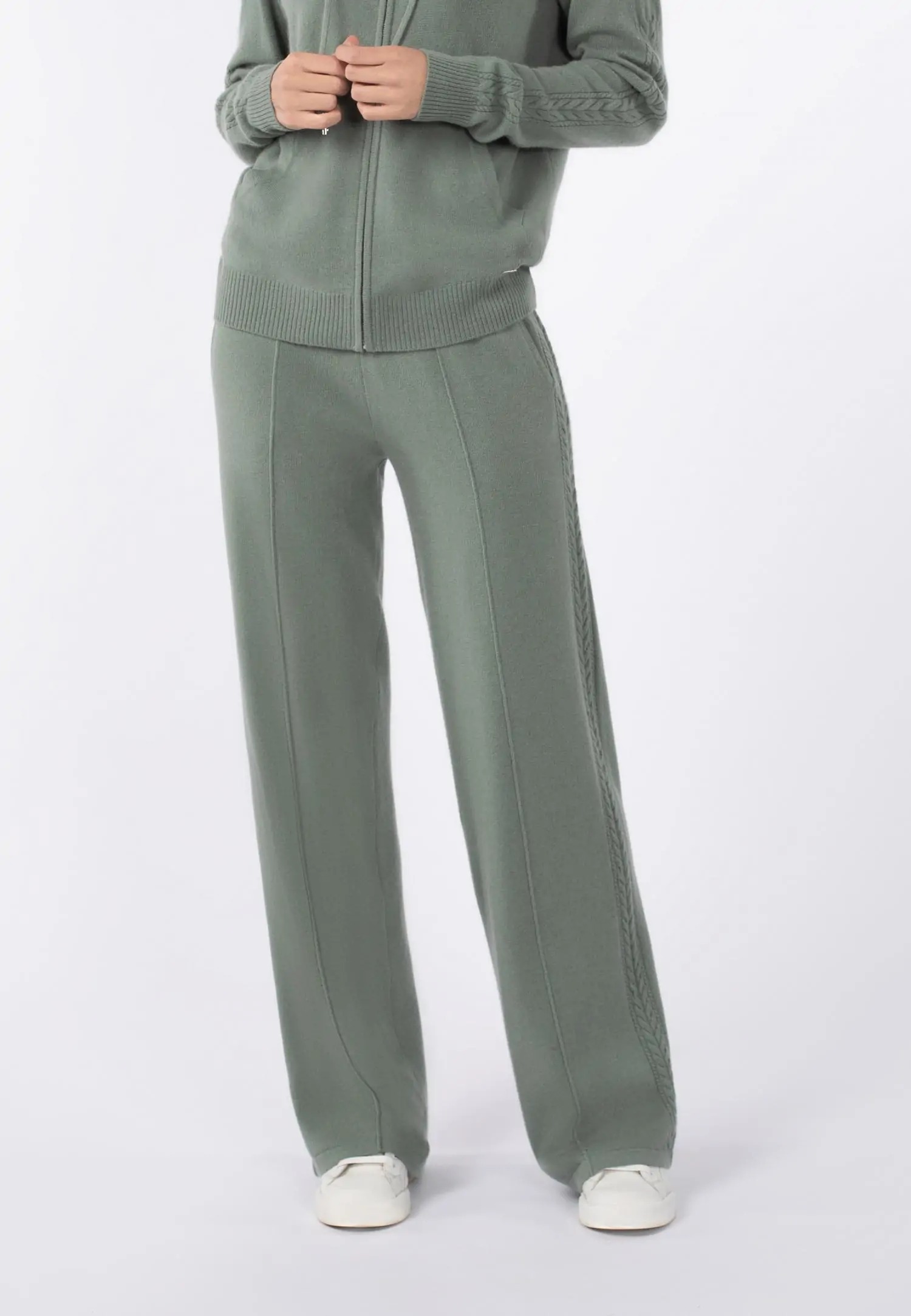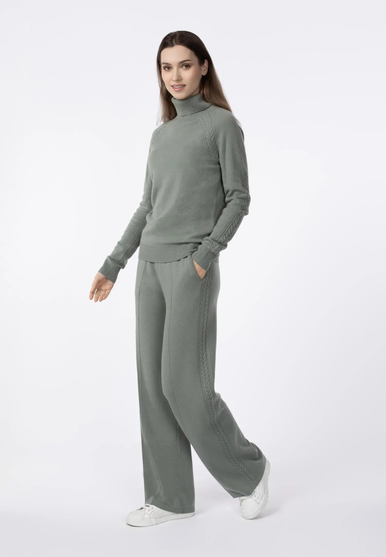 Eksklusiivse kašmiirlõnga sisaldusega laialõikelisted püksid. Pükstel on praktilised küljetaskud ja reguleeritava tunnelpaelaga nutikalt disainitud soonikkoes ilma kummipaelata, kuid samas elastne ja hoidev värvliosa, mis tagavad ideaalse istuvuse ja liikumisvabaduse. Säärte esiosas olevad salendavat efekti loovad disainõmblused toovad esile naiseliku figuuri ja lisavad enesekindlust. Elegantsi ja luksuslikkust rõhutavad piki külgi kulgevad palmikkoes kootud detailid. Kombineeri neid pilkupüüdvaid pükse julgelt sama seeria teiste toodetega, et luua harmooniline ja muljetavaldav rõivakomplekt. Uhkusega disainitud Eestis!