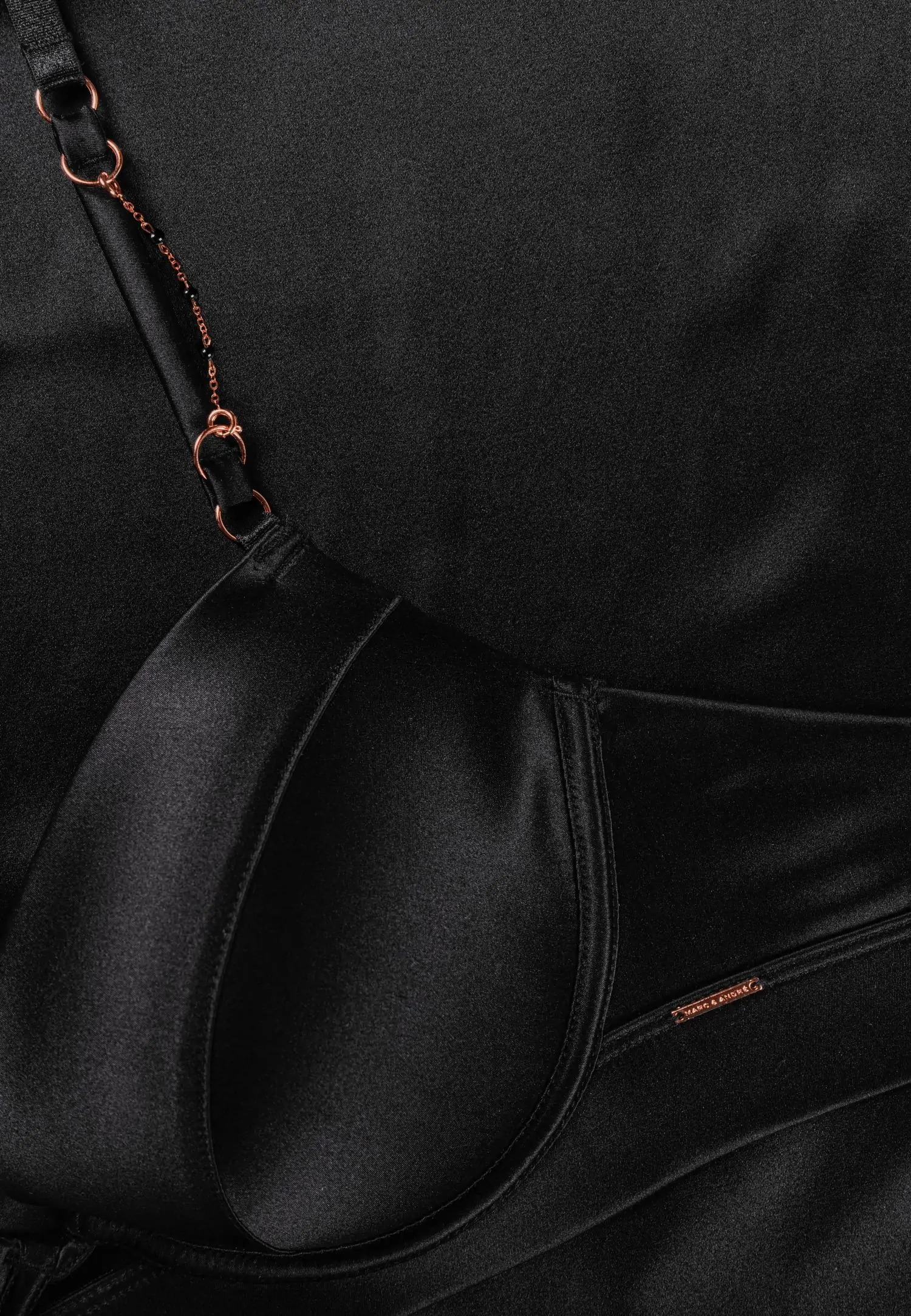 GLAMOUR GIRL pesuseeria kajastab täpselt maailmakuulsa pin-up-modelli ja dramaatilise näitleja Lana Turneri stiili, kellest sai sõna otseses mõttes 1940.-1950. aastate stiiliikoon. Sellest pesuseerias on ühendatud siidikangas, mustad pärlid, klassikalised siluetid ja vintage-šikk – Hollywoodi kuldajastu oma parimal kujul. Siidi-ja viskoosisegu kangaga kaetud vormitud korviga push-up rinnahoidja õlapaeltel on kaunsitusena eemaldatavad pärliketid. Toode on disainitud ja arendatud Eestis!
