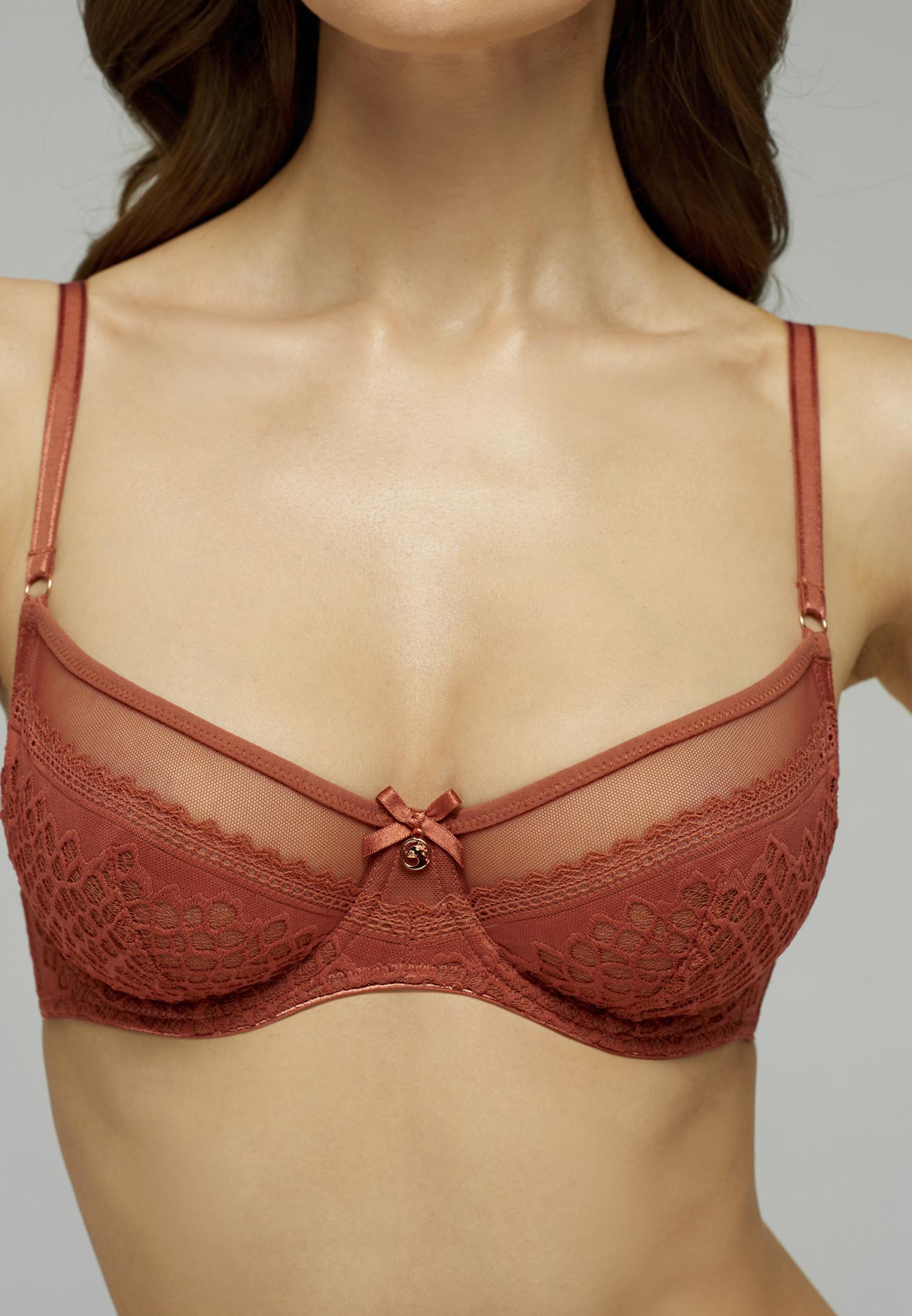 Modernselt tekstuurne pits ning võrratu terrakota värvitoon! See rinnahoidja on õhukese polstriga kerge ja pehme ning jätab avarama dekoltee. Rinnahoidja korvide kuju on koondatud õlgadele, mis annab rinnahoidjale kauni kolmnurkse välimuse. Kohati kaunilt läbikumav pits lisab mängulisust ja võlu.