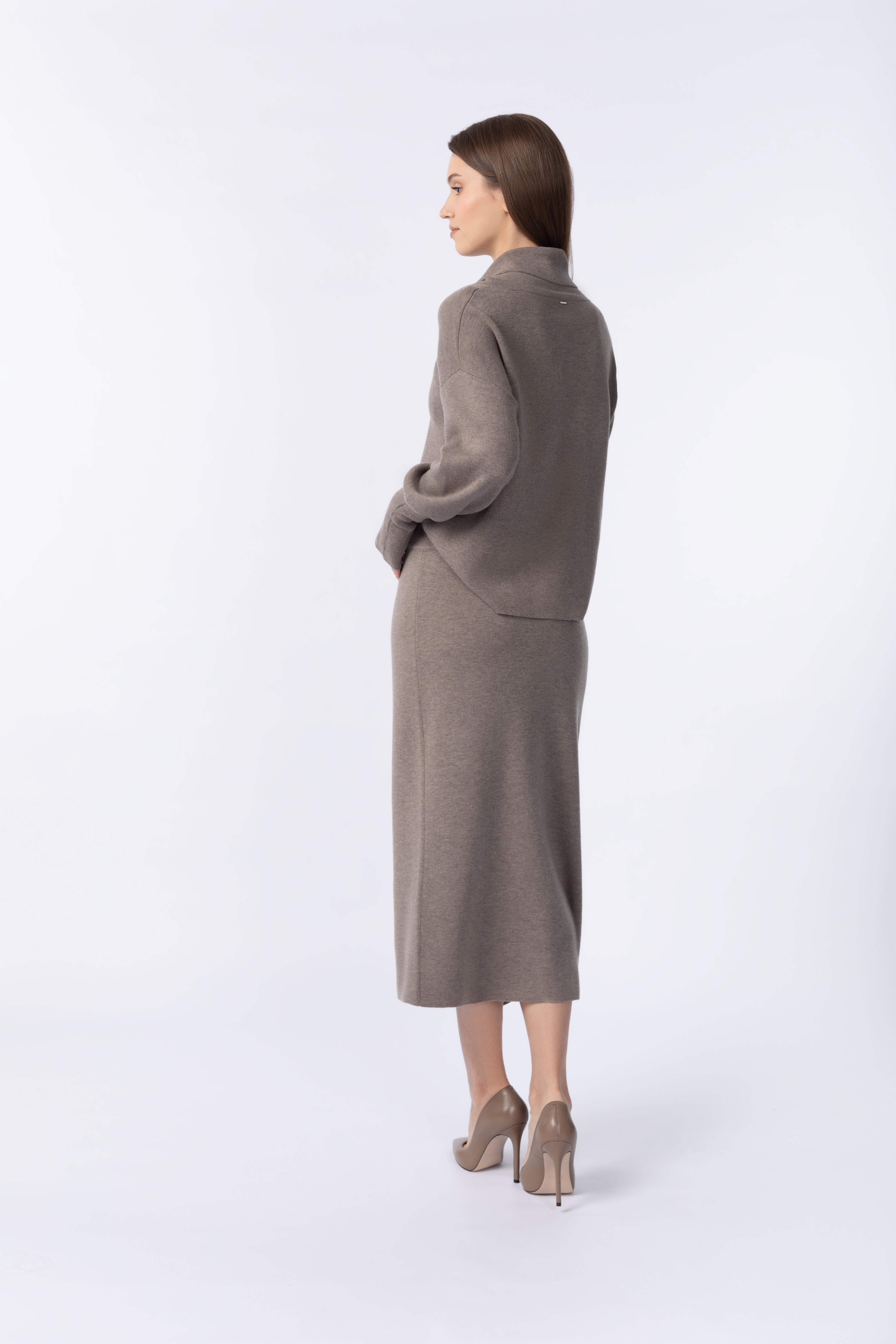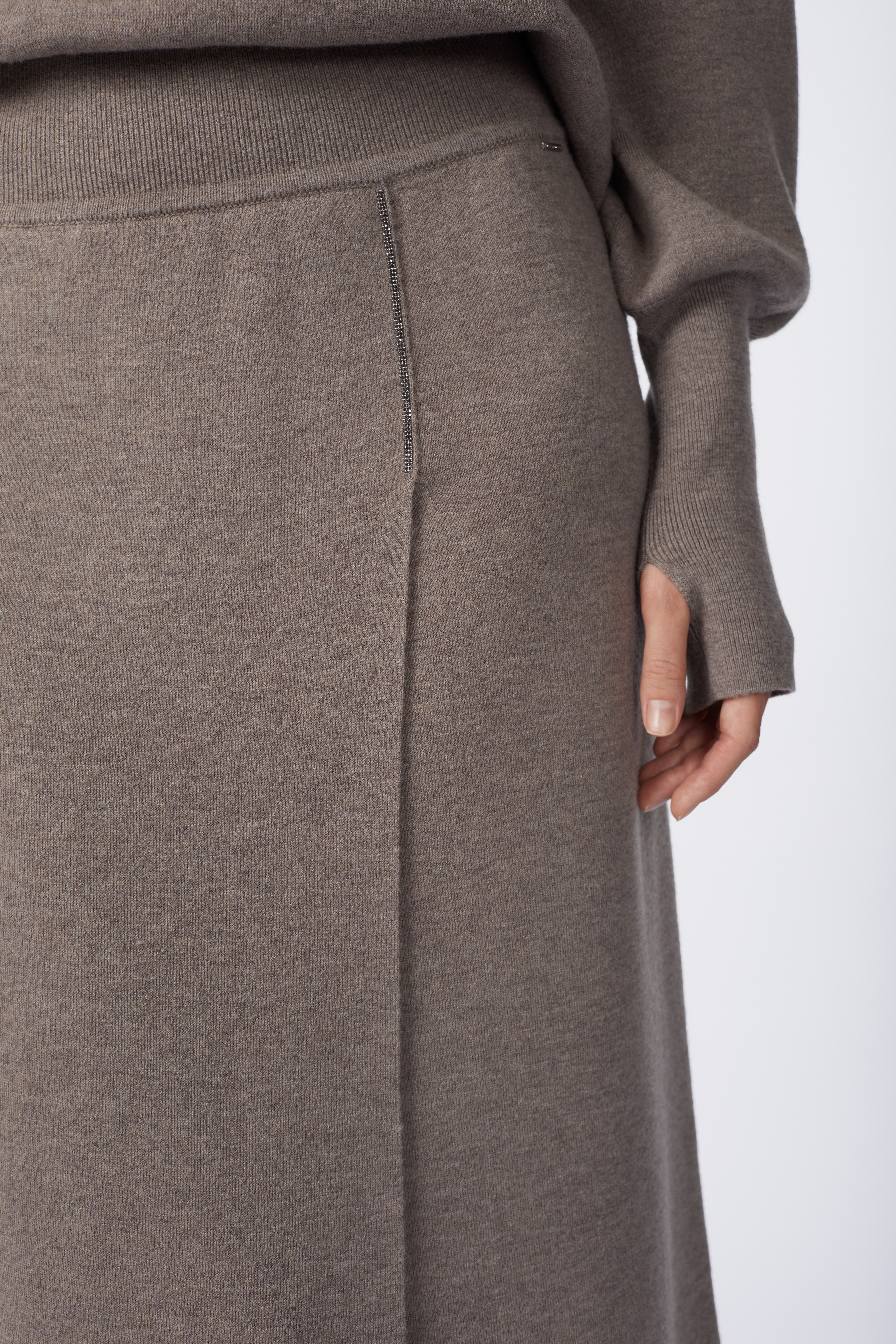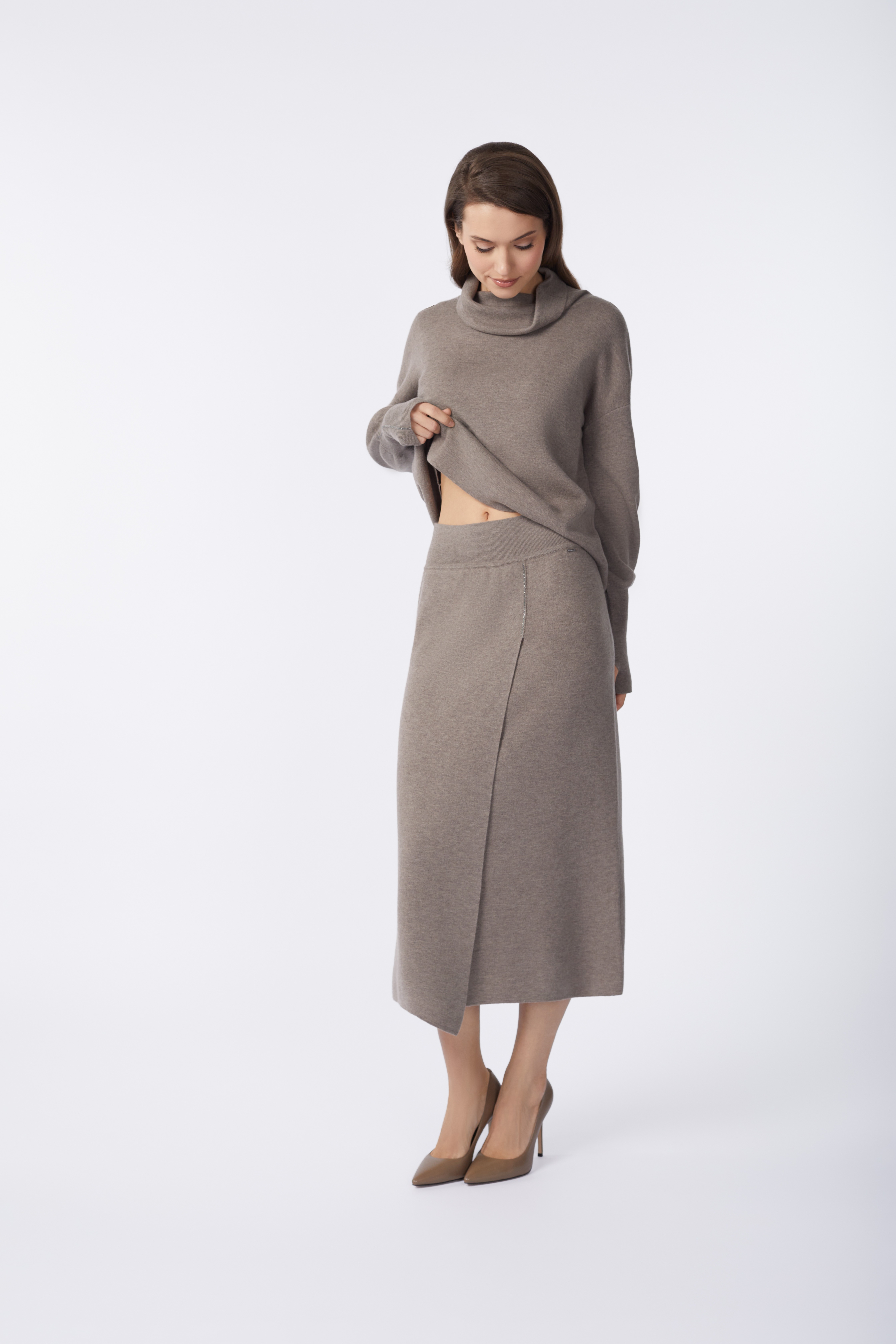 Kergelt A-lõikeline, veidi põlvest allapoole ulatuv seelik on kootud luksuslikust kašmiiri- ja meriinovillasegu lõngast. Seelikul on veidi kõrgem tihedas soonikkoes vöökoht ning ees kahekordse kihiga hõlmikdisain, mis loob peenelt seksika, kuid samas maitsekalt stiilse välimuse paljastamata säärt ja hoides sooja. Peened kettdetailid ülakattel lisavad tagasihoidlikku, kuid elegantset aktsenti. Seelik on kootud interlok-koes, mis tagab kudumi mõlemale poolele siledad ja tihedad pinnad. See kude hoiab hästi vormi, imab niiskust, säilitab soojust ning on vähem veniv. Toode on uhkusega disainitud Eestis!