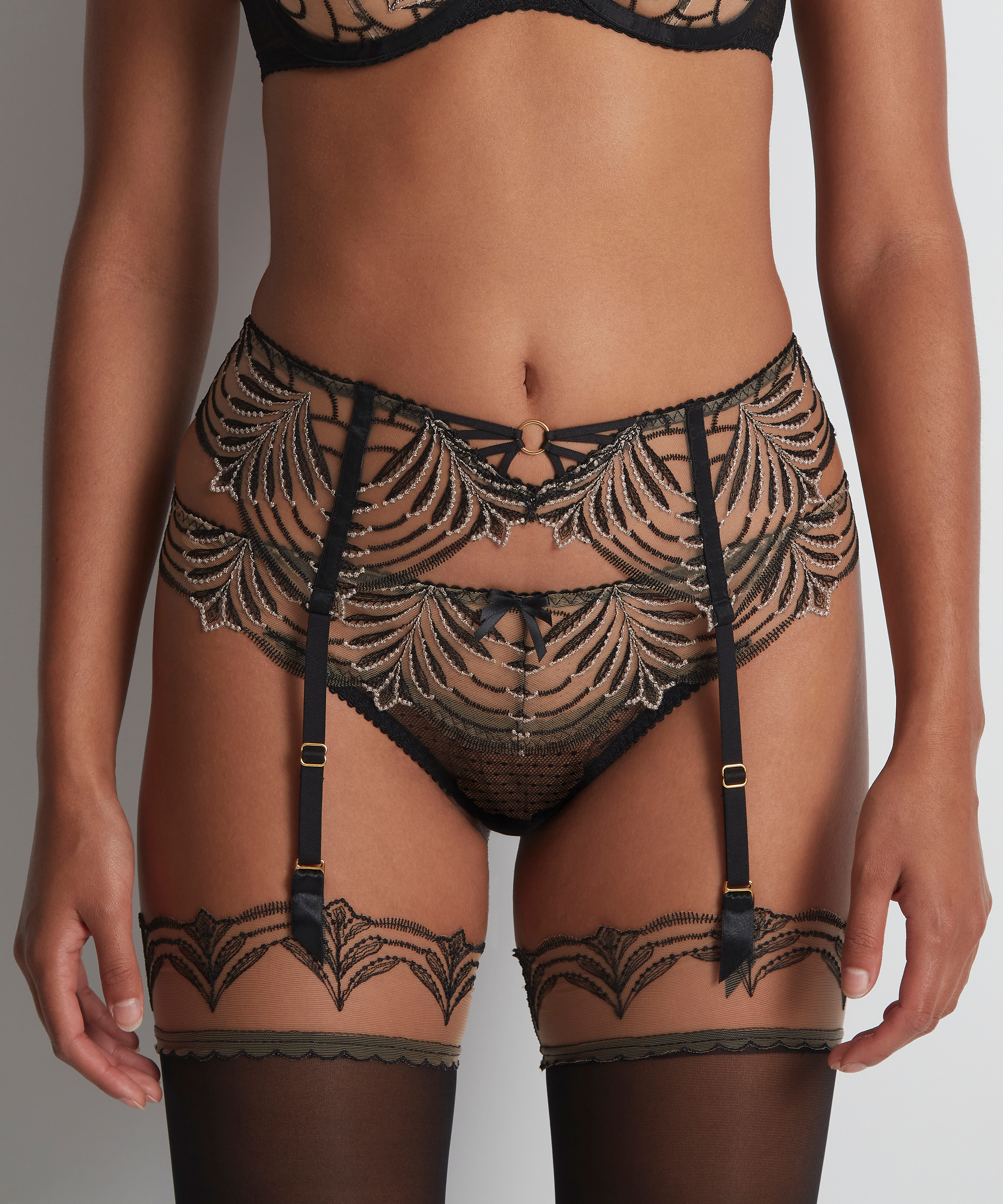 Seljalt petlikult lihtne ja täiesti läbipaistva kerge tülliga, kuid esiosa peenelt luksusliku elegantse tikandiga, mis on põimitud kuldsete niitidega. Selle sisseehitatud traksid on mõeldud Aubade sukkade jaoks, kujundades figuuri enesekindlaks ja sensuaalseks.